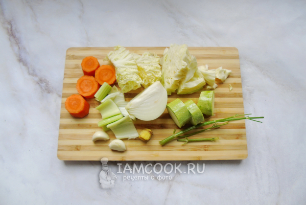 Морковь, лук очистите и помойте. Кабачок и стебель сельдерея помойте. Нарежьте эти овощи произвольно, но не мелко. Так же поступите с белокочанной и пекинской капустой. Чеснок и имбирь очистите, помойте. Зелень помойте, можно оставить только стебли.