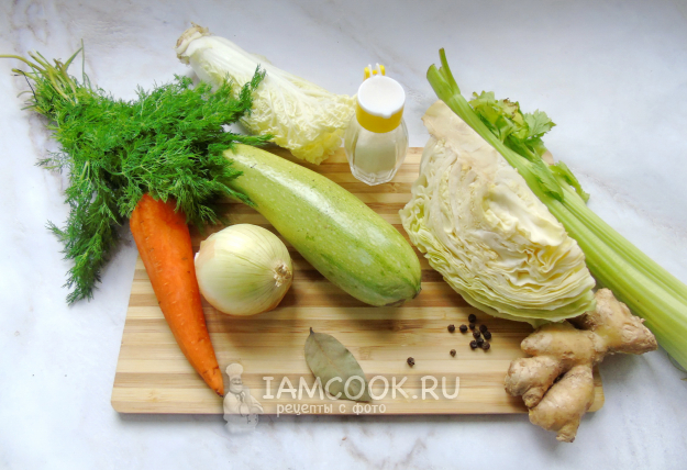 Соберите все ингредиенты для приготовления овощного бульона.