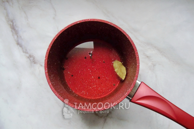 В кастрюлю налейте воду. Добавьте лавровый лист, соль и перец горошком.