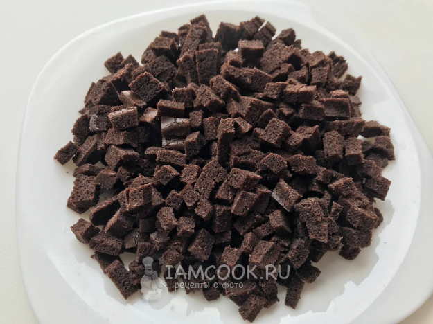 Остывший бисквит (корж) нарезать на мелкие кубики.