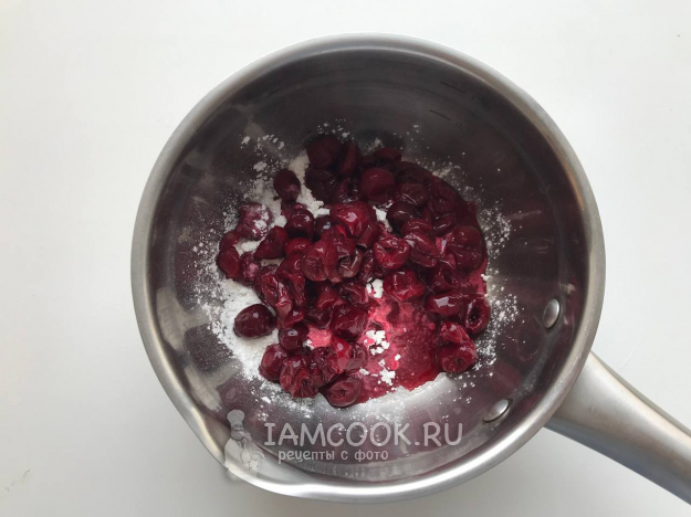 Вишню заранее достать из морозилки. В сотейнике смешиваем вишню, сахар, кукурузный крахмал.
