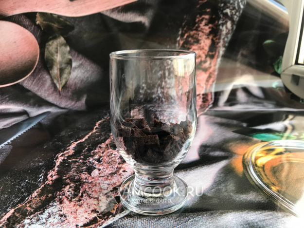 Теперь собираем трайфл. В стакан выкладываем кусочки бисквита (коржа).