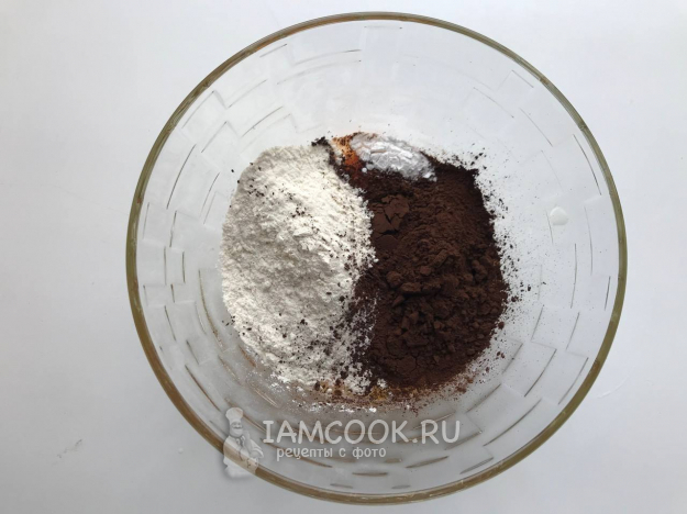 Добавляем сухие ингредиенты: муку, какао, разрыхлитель.