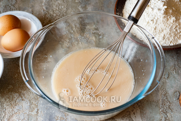 Добавим теплую воду и венчиком всё перемешаем до полного растворения дрожжей.