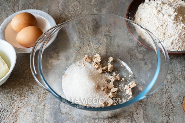В миску разотрем пальцами прессованные дрожжи, добавим 2 ст.л. сахара.