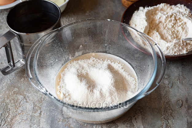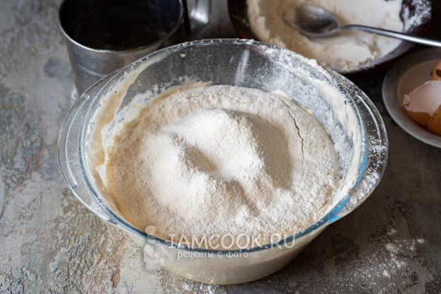 Затем начнем частями просеивать муку, при этом будем замешивать тесто сначала ложкой, а потом продолжим замес руками. У вас может уйти чуть больше или чуть меньше муки, поэтому в ингредиентах указано приблизительное количество.
