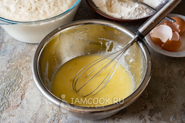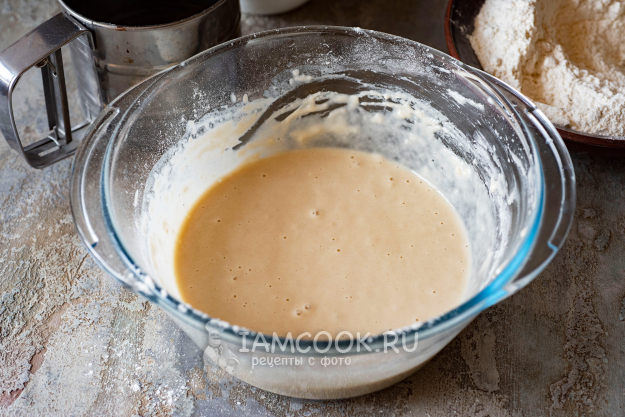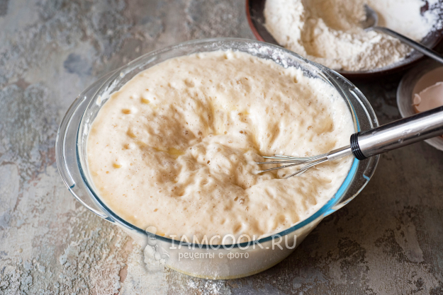 Перемешаем всё венчиком - это опара. Миску с опарой накроем кухонным полотенцем и оставим в теплом месте созревать примерно 30 минут.