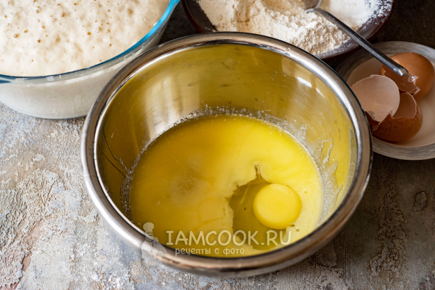 В отдельной миске соединим растопленное сливочное масло и оставшийся сахар, вобьем яйца.