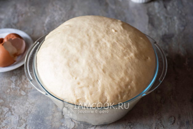 Оставим тесто подходить в теплом месте в миске, накрытой кухонным полотенцем, примерно на 1,5 часа. За это время тесто потребуется 1-2 раза обмять.