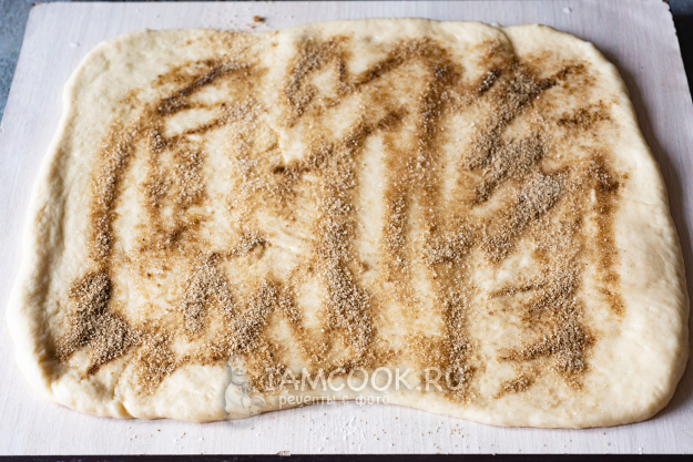 Приготовим сладкие воздушные как пух булочки. Для этого раскатаем тесто в пласт в виде прямоугольника, который смажем слоем растительного масла. Для начинки смешаем в одной мисочке сахар и корицу, и полученной смесью покроем раскатанное тесто равномерным слоем. Пласт свернем в рулет.