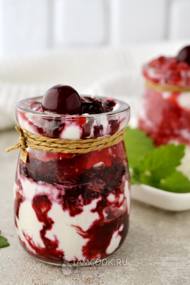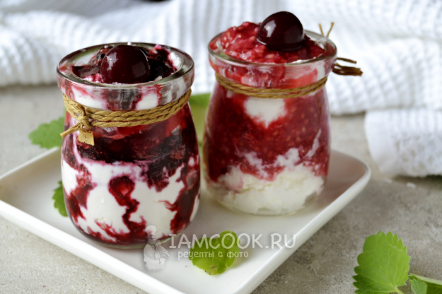 Затем положите ягодное пюре. Затем опять творог и на верх - ягоды. Кето-десерт из творога готов.