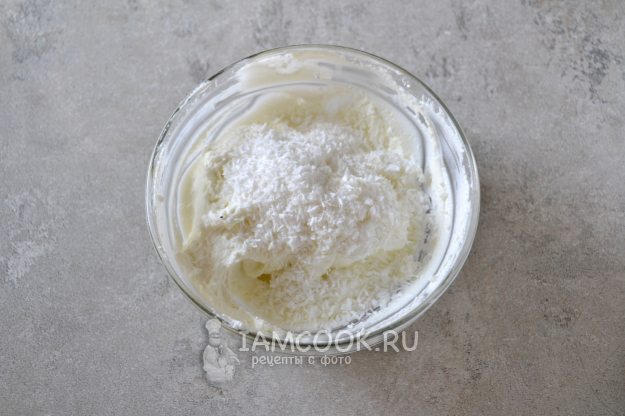 Добавьте кокосовую стружку в творожную массу и перемешайте.