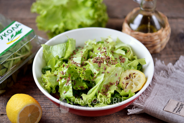 Также помойте и обсушите латук, добавьте в миску, порвав его руками. Щедро сбрызните ингредиенты лимонным соком и оливковым маслом, посыпьте льняными семечками, чуть посолите и поперчите, перемешайте.