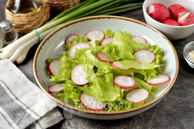 Порвите латук небольшими ломтиками, выложите на дно плоской тарелки, посыпьте нарезанным тонкими кружочками редисом.