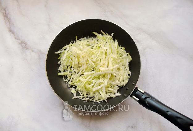 Белокочанную капусту нарежьте и выложите в сковороду. Налейте 2-3 столовые ложки воды. Посолите, поперчите по вкусу.