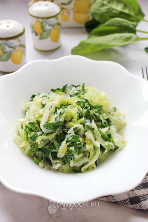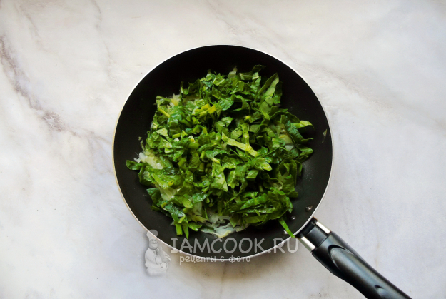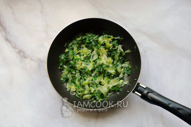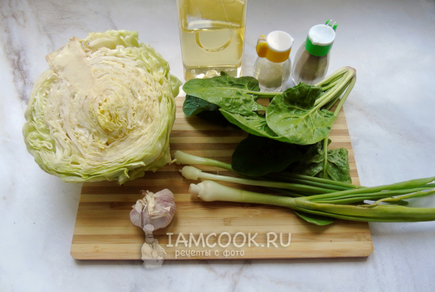 После нарежьте шпинат и зеленый лук и выложите в сковороду с капустой и чесноком.