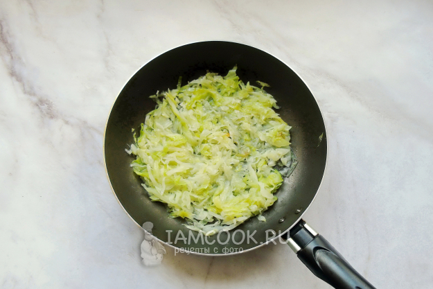 Накройте сковороду крышкой и тушите капусту на среднем огне 8-10 минут, до уменьшения в объеме.