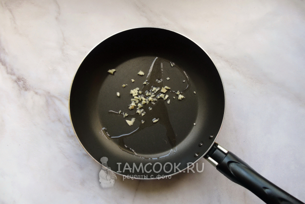 Чеснок очистите, нарежьте и выложите на сковороду с разогретым растительным маслом. Слегка поджарьте, до появления легкого запаха.