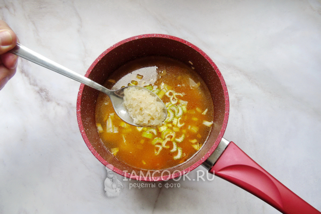 Через 15 минут кипения супа выложите в кастрюлю промытый рис. Посолите, поперчите и добавьте сушеный базилик или другую приправу по вашему вкусу.