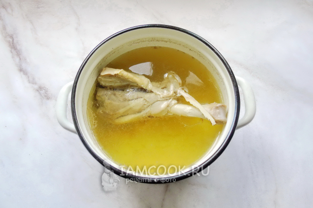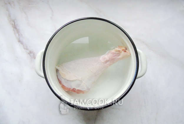Сварите бульон из индейки. Помойте её и выложите в кастрюлю, залейте свежей водой.