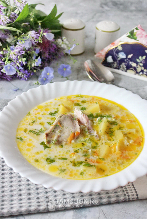 Сливочный суп с индейкой готов. При подаче в тарелку добавьте отварную индейку.