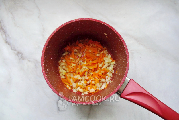 Лук мелко нарежьте, а морковь натрите на терке. Выложите в кастрюлю, налейте растительное масло и пассеруйте овощи 7-8 минут.