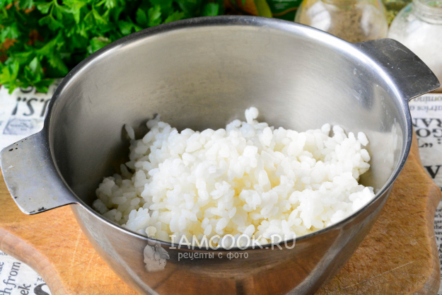 Рис промойте и выложите в кипящую воду. Посолите по вкусу и варите 15-20 минут до готовности. Лишнюю воду слейте, а рис остудите. Для варки можете использовать достаточное количество жидкости, которую после приготовления просто сольете в раковину. В рецепте можно использовать как круглый, так и длинный рис, на ваш вкус.