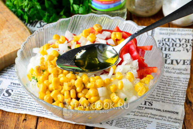 С кукурузы слейте всю жидкость, затем добавьте ее в салат. Блюдо поперчите по вкусу и полейте оливковым маслом. Салат перемешайте.