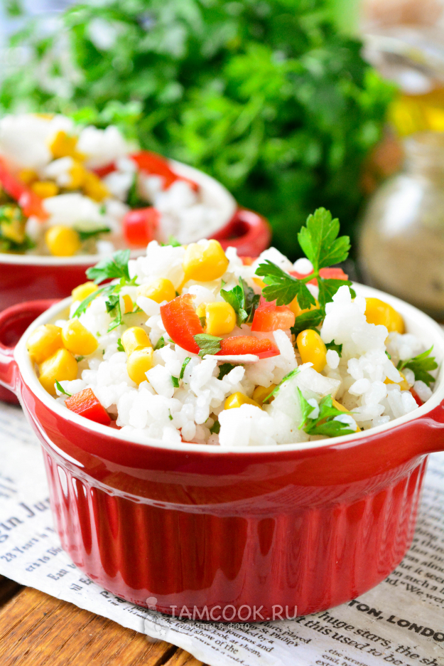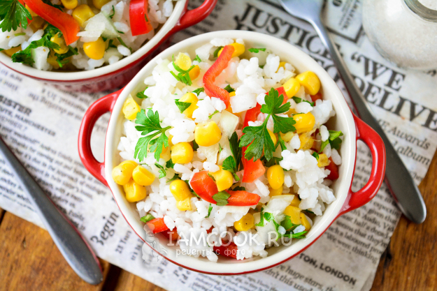 Закуску сразу подавайте к столу. Яркий, вкусный и аппетитный салат с рисом и кукурузой понравится вам и вашим гостям.