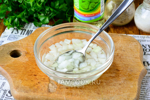 Выложите лук в отдельную мисочку, влейте 150 г воды и добавьте яблочный уксус. Оставьте лук мариноваться на 10 минут, после чего слейте всю жидкость.