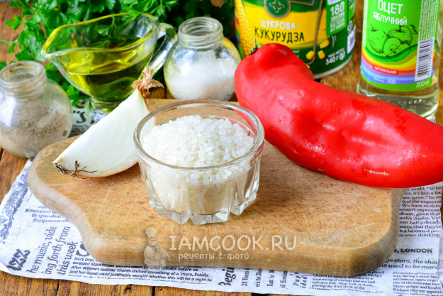 Подготовьте по списку необходимые продукты для приготовления салата с рисом и кукурузой.
