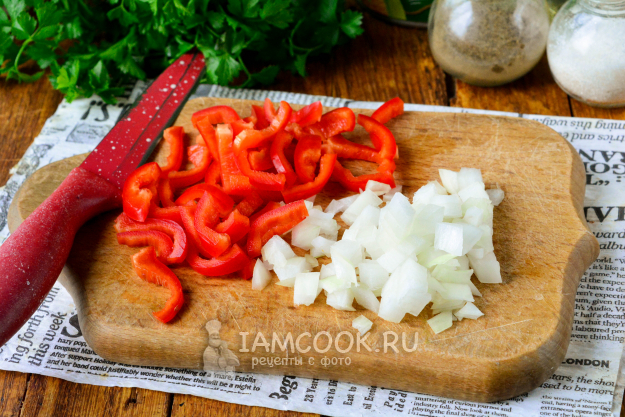 Сполосните и почистите овощи - репчатый лук и красный сладкий перец. Перец нарежьте полосками или соломкой, а лук - кубиками.