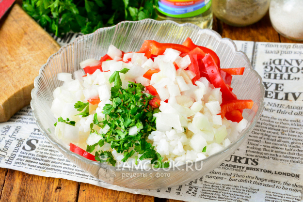 Соедините в салатнике отварной рис, сладкий перец, маринованный лук и добавьте мелко нарезанную петрушку.