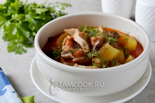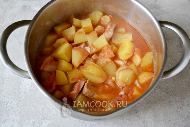 Поставьте кастрюлю на огонь, после того как закипит, сделайте огонь ниже среднего и тушите блюдо до мягкости картофеля. Во время тушения посолите.