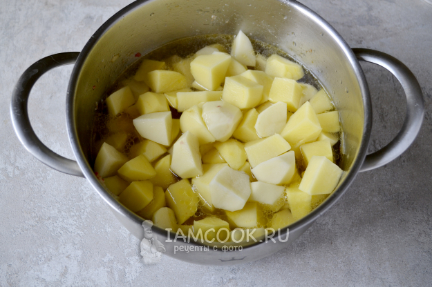 Добавьте нарезанный некрупно картофель, влейте горячую воду.