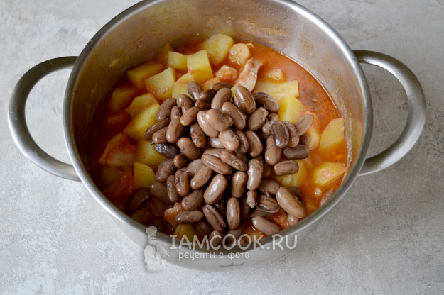 В конце тушения положите вареную или консервированную фасоль, перемешайте, прогрейте блюдо еще 5 минут. В конце тушения можете добавить любимые специи и лавровый лист.