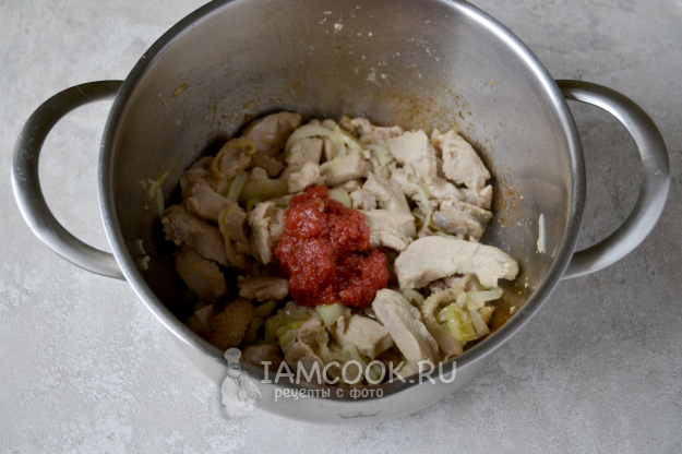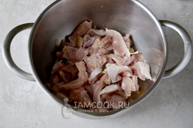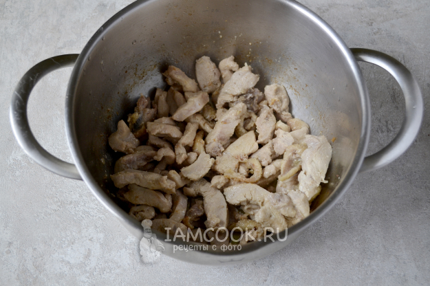 Куриную грудку нарежьте соломкой (кубиками). Влейте в кастрюлю с толстым дном или сотейник растительное масло, разогрейте, положите нарезанное мясо.