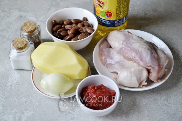 Соберите продукты для приготовления курицы с фасолью и картошкой. Фасоль промойте и залейте чистой водой на ночь. Картошку и лук очистите.