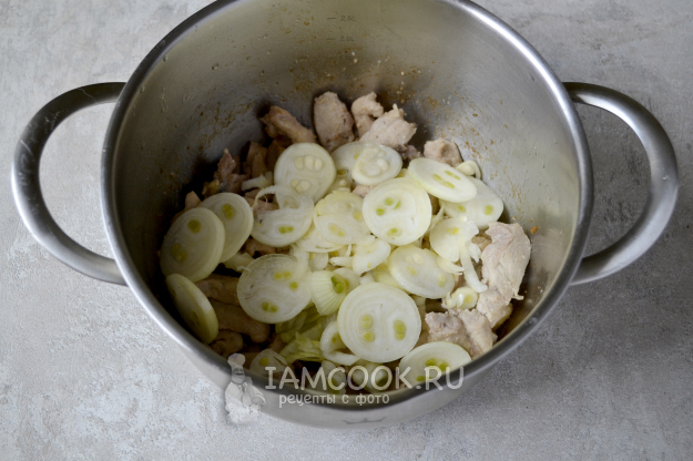 Положите на мясо нарезанный лук. Перемешайте, обжарьте еще 5-6 минут на огне чуть выше среднего.