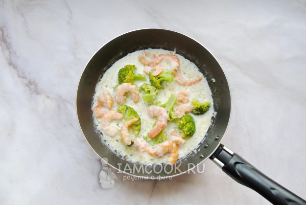 Варено-мороженые креветки обдайте кипятком. Очистите от головы, панциря и кишечной вены. Добавьте в сковороду.