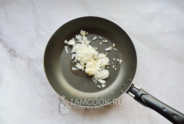 Чеснок и лук очистите, помойте, мелко нарежьте и выложите в сковороду с растительным и сливочным маслом. Жарьте до прозрачности лука.