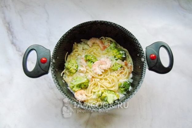 Перемешайте спагетти с соусом из брокколи, креветок и сливок.