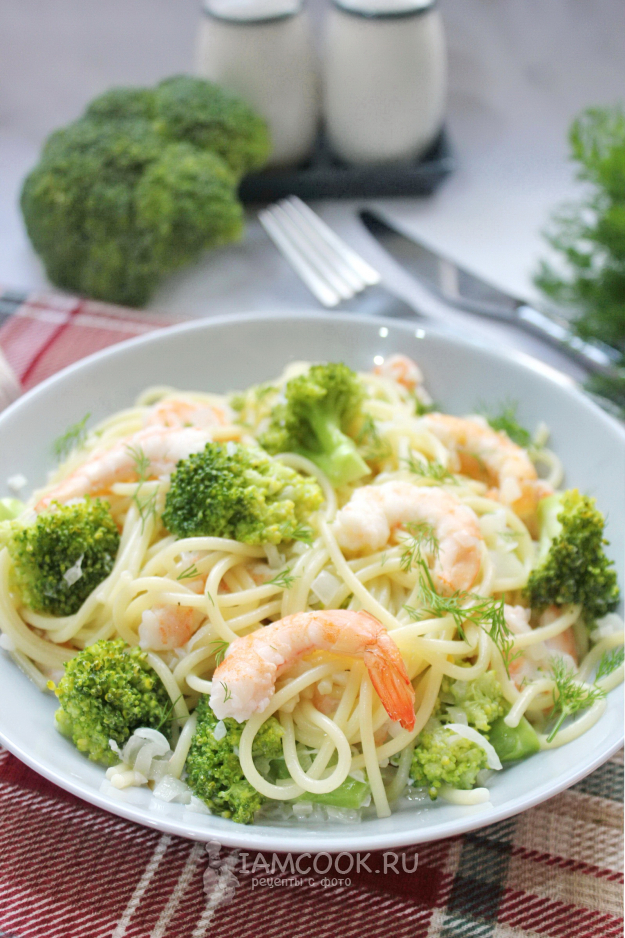 Паста с брокколи и креветками готова. Сразу подавайте на стол.