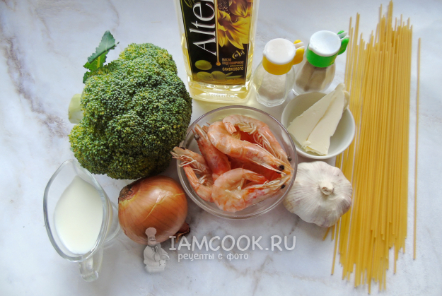 Соберите все ингредиенты для приготовления пасты с брокколи и креветками.