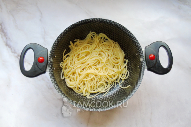 Пасту отварите в подсоленной воде согласно инструкции на упаковке. Откиньте на дуршлаг.