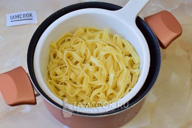 В это время уже готова паста. Откиньте её на дуршлаг, чтобы стекла лишняя вода.