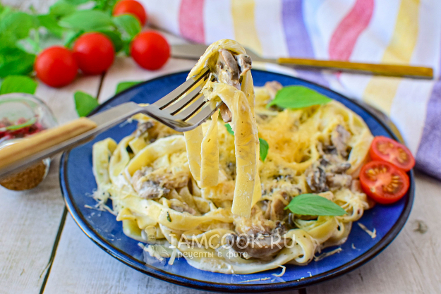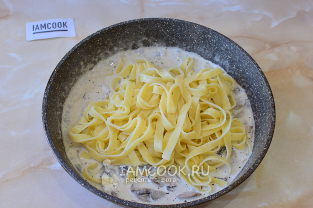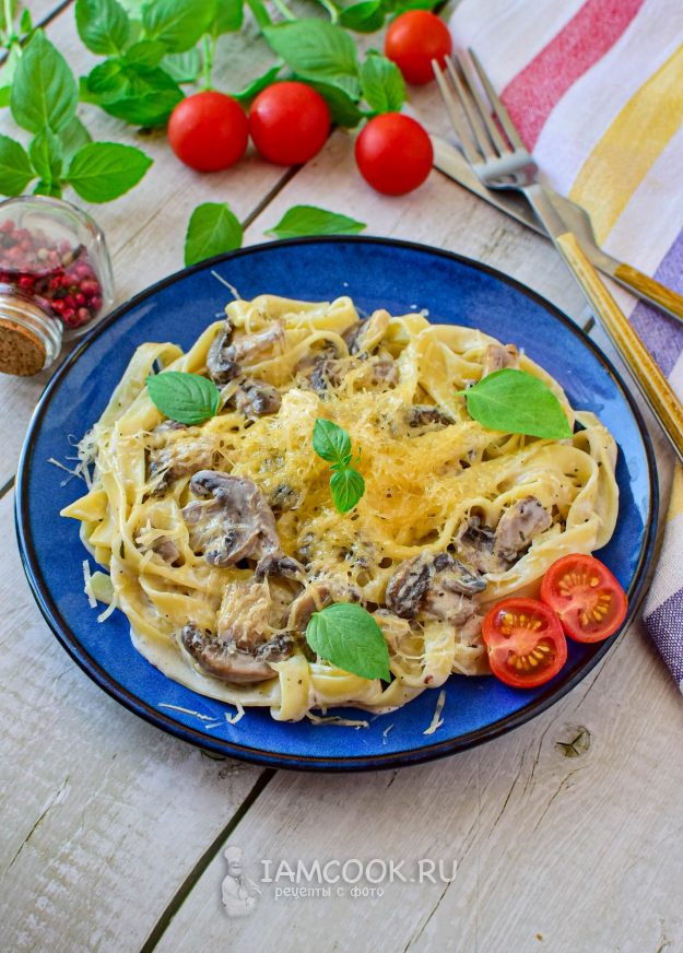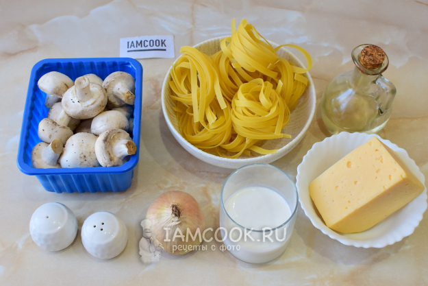 Возьмите все необходимые продукты для приготовления тальятелле с грибами в сливочном соусе.