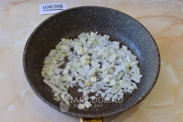 Очистите и мелко нарежьте лук. Обжарьте его пару минут в растительном масле.