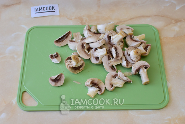Пока жарится лук, промойте и нарежьте грибы. Нарезайте их крупно. При жарке они уменьшатся в размере.