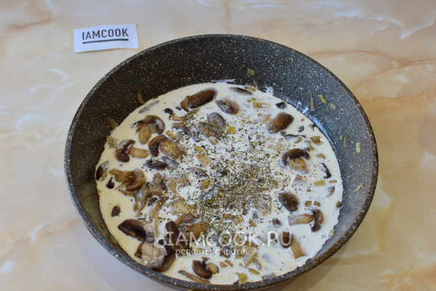 Грибы залейте сливками. Посыпьте солью и специями. Для аромата можно добавить чеснок.
